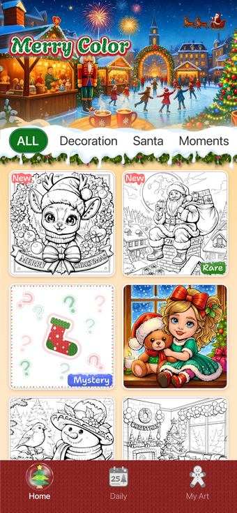 In aggiunta, Merry Color offre una funzione Daily Picture, in cui gli utenti possono completare un'opera d'arte al giorno e ricevere un messaggio di incoraggiamento sotto forma di una carta di benedizione natalizia. Questa caratteristica arricchisce ulteriormente l'esperienza, rendendo ogni giorno di dicembre un'opportunità per celebrare la creatività e il calore delle festività.